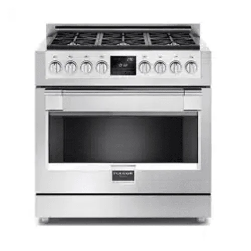 36” DUAL FUEL RANGE l Stainless Steel Finish l 6 Powerful 18,000 & 20,000 BTUs Burners l Dual Crescendo Burner l Heavy Duty Continuous Grates l Dual Convection l Soft Closing Door l Self Clean Oven l Cool Touch Door l Multi-level Cooking l Telescopic Rack l Digital Controls l Meat Probe l Fast Pre-Heat